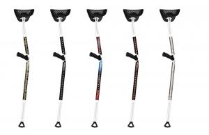 The angled shape of the stylish new crutch provides good hip clearance. There are other more subtle differences as well. Adjustable cantilevered grips put pressure on the meatiest part of the palm instead of the wrist. Rocker feet absorb the shock of stride. An articulated under-the-arm mesh saddle design û which pivots and rotates with the body û is made with a proprietary temperature-sensitive rubber that doesn't sag. Height and arm lengths are both adjustable for people from 4 ft. 9, to 6 ft. 4 and up to 300 lbs.