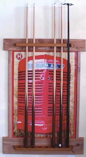 As an example of what he can do, he made a mural of 6-in. tiles showing the grille of a Farmall H. He mounted the tiles on a cement board formed with redcedar and fitted with pool cue holders. It mounts in his basement game room.