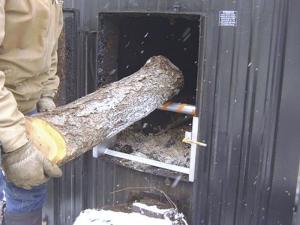 The new "stove stoker" mounts on the door frame and is held in place by a pair of locking handles. A steel roller on top of the unit serves as a support so you can roll big logs into the firebox.