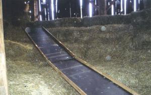 Donald Green's slick surfaced bale slides make moving bales in and out of his barn easy. Green harvests 10,000 bales a year for sale and delivery to area horse owners, who prefer the small squares. Any help he can get in his mostly manual operation is appreciated.