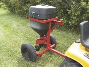The spreader holds 300 lbs. and is gravity fed with 10 different settings, depending on the granule size. “It’ll spread from 10 to 16 ft. wide depending on how fast I drive,” says Momper.