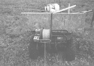 To unroll wire, Bjork mounts a spool on the back rack of the ATV (or on front next to the box) by inserting a post through the center of the spool and strapping both ends down to the ATV frame.