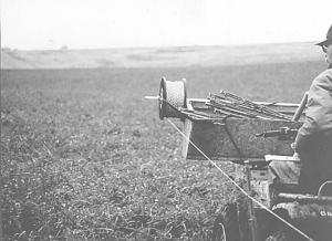To take the fence down, he puts the spool back on the wire winder and wire is pulled back through the "eyes" in the posts and guided through a steel loop on the frame that helps keep the wire from getting tangled up on the spool.
