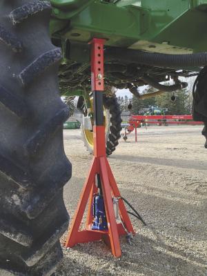 Horn developed his high clearance sprayer jack for area farmers and ag retailers. It’s tubular steel with a 2 1/2 by 2 1/2-in. inside leg that slides inside a piece of seamless 3-in. tubing. Four legs provide solid bracing, sinking slightly into the ground and anchoring the jack in most soils.