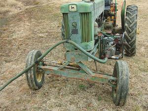 “The wheels and spindles came from the steering axle of an old Deere combine,” says Kimball. “I used angle iron to make the axle tube. The original single front wheel was mounted off center, so I had to be careful to mount the pivot points the same amount to the side.”