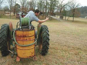 “The large feeder hose wraps around the tractor,” explains Kimball. “I can drive alongside a water source and fill the barrel in 2 to 3 min. from the time I start the engine.”