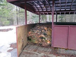 Baril dumps material almost daily into one of the bins. If the material is too dry, he wets it down by activating a sprinkler head located above the bin. As the bin fills, he uses his loader tractor to turn the material over every 5 days or so for 6 months. Then he uses his loader tractor to move the material to the next bin, and begins to throw fresh waste in the empty one.