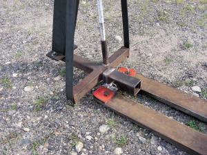 He also made a receiver hitch socket that bolts onto forks on his front-end loader. The socket is welded to the middle of a 1-ft. long, 3 1/2-in. wide steel plate with holes drilled through it. Holes are also drilled through the forks, which are spaced about 5 in. apart.
