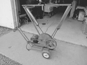 This 2-wheeled carrier was designed to pick up a milk can so the operator didn’t have to. It came with a U-shaped metal rod near the top and a long handle on back. The operator placed the rod around the neck of the can and then pulled back on the handle to lift the can off the floor. As the can came up it tilted in toward the carrier, causing it to always stay level.