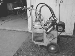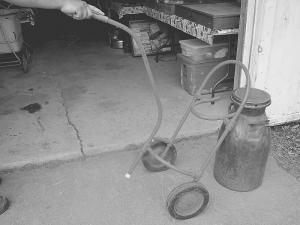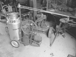 This electric-operated, 2-wheeled milker milked 2 cows at a time and delivered the milk into a big glass jar. The motor belt-drove a gearbox that pushed and pulled a vacuum cylinder that pumped milk into the jar. When the jar was full the operator picked it up and poured the milk into a can.