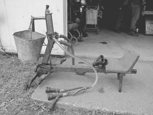 Patented in 1892, the Mehring milker was used from the late 1800’s to 1920. It milked 2 cows at a time and in 1914 was advertised for sale at $75. The operator sat down on a built-in chair and pedaled bicycle-style to create vacuum in the pump. The milk was delivered into a pail that hung from a spigot.