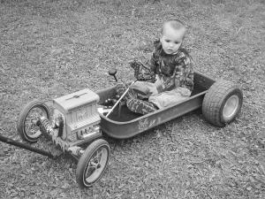 FARM SHOW found Justin Schmitz pulling his 2-year-old son Colton around in what looks like a child-sized “rat rod” at an antique tractor show near Albany, Minn. The plastic engine is actually a carrying case for Hot Wheels toy cars. It mounts on a subframe between the wagon and front axle.