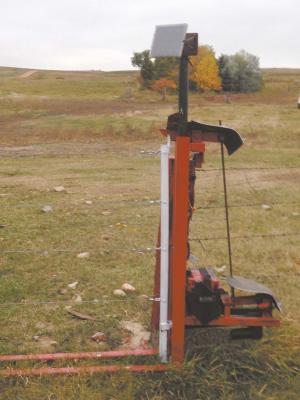 Why get out of the tractor to open a gate when all you have to do is hit a remote? Schirado’s remote-controlled gate uses a solar-powered linear actuator to hold, release and relatch the gatepost. The gatepost is hinged at ground level. The actuator simply lays the post and its attached cables down on the ground.