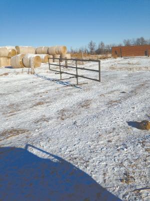 “I set it in place on the pressure side of a pen, and I’ve never had a problem with cattle pushing it aside,” says Schirado. “I added a set of 30-in. long pipes to the gate. They stick out perpendicular to the sides and let me pick it up with a bucket.”