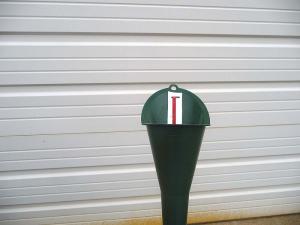 The bottom of the pipe has a small hole in it. The floating balls push up on a long wooden rod that comes up through the pipe and into the center of the funnel. Easter placed a piece of white tape at the top of the funnel and marked it where the top of the rod should be when the tree stand is full of water.