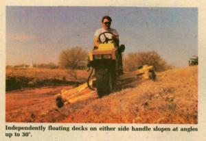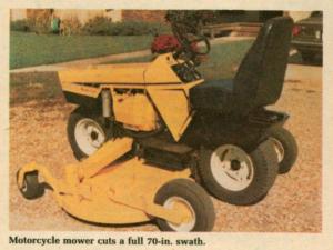 The first-of-its kind mower features power steering and hydrostatic drive. Travel speed is infinitely variable up to 12.5 mph. "Although the decks could be removed and the cycle operated independently as a 2-wheel motorcycle, it wasn't designed for this type of dual use," says Delmar Hostetler, manufacturer.