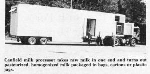 "Here's an opportunity for dairy farmers to eliminate the middleman and receive $20 or more per hundredweight for milk produced on their farm," says the manufacturer of the new mobile Canfield Unitized Milk Processing System. Packaged inside a 40 x 8 ft. trailer unit, it takes in raw milk at one end and delivers pasteurized, homogenized, packaged milk out the other end at the rate of 500 gal. an hour.