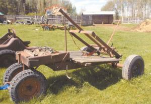 Josephson started with a back axle and frame off an old trailer. The axle was long enough that the wheels fit around the end of a bale. He cut the front third of the trailer frame off and reattached it over the rear frame. This raised it enough to mount a front axle with truck wheels under it.