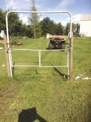 The gate measures 54 in. wide – the size of his ATV - and is made from 1/2-in. pvc tubing formed into a pair of rectanglular “swing doors” that have 14-ga. non-insulated electrical house wire wrapped around them. The “swing doors” swivel at the top and bottom on homemade metal brackets, which attach to a 6-ft. sq. frame made from 1 1/4-in. pvc conduit. Both sides of the frame are strapped to wooden posts on either side of the gate.