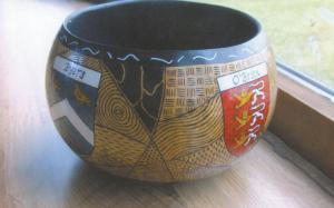 He stains the interior with 3 coats of dye and covers the interior and exterior with clear polyurethane to cover blemishes. He measures a 1/2 to 1-in strip around the lip of the gourd, then brushes on 3 coats of black or other dark-colored acrylic paint. He paints the rest of the bowl tan. Designs and decorations are mostly done free hand with check marks, circles, and so forth.