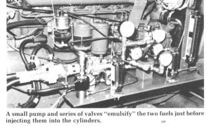 "The system meters and emulsifies the fuel just ahead of the fuel injectors. That means it suspends the one fuel in the other for as complete a mix as possible of the two as they enter the cylinders. The mix isn't necessarily stable but it doesn't have to be since the emulsified fuel is burned immediately," explains Agosto.