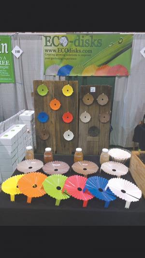 The former biology teacher and long time salesmen in plastics combined his experiences to mold disks from biopolymer made of corn sugar and vegetable and fruit pulp. The infusion of carrot, potato, apple and cranberry pulp release nutrients in the soil if the disks are left in the garden to decompose. Or, the disks can be rinsed off and used for one or two more summers.