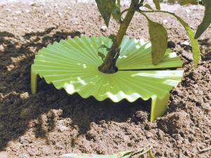 “It blocks the weeds from growing around the base of the plant. And it has ridges that collect water and channel it to the base of the plant where it needs it the most,” he explains.