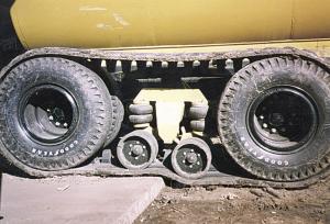 The "Track Star" non-driven running gear is designed to carry manure spreaders, spray tanks, or grain carts. The undercarriage and two bogie wheels on each side are suspended between 15 by 22.5 truck tires.