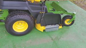 “It stops stones from flying out but lets the grass clippings go through. I wouldn’t want to cut grass without it,” says Robbins. “Because there’s no discharge chute I can mow around trees on either side.”