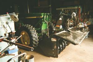 His solution was to remove the top part of the snowblower housing and attach a home-built, hydraulic-operated metal “door” in its place. The hinged door attaches to the top of the snowblower mounting brackets and is raised up or down by pulling a lever in the cab. A steel cutting edge is welded to the bottom of the door.