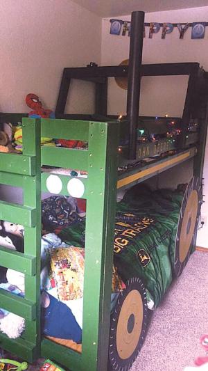 Vern added clips to the tires so they can be removed easily when Mindy changes the sheets, which are also patterned after farm machinery.
