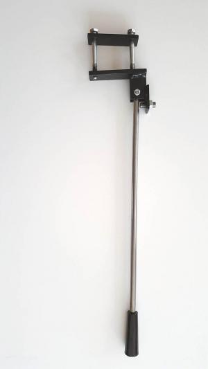 The lever is a very simple device that is held in place ahead of the starter. It consists of a steel bracket that clamps to the front fender support bar. Two bolts go through the bracket to a flat bar with matching holes.