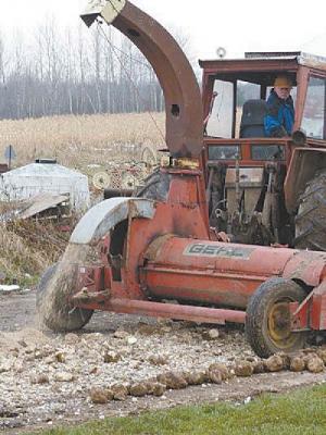 To use the machine, Greshner makes a 3-ft. wide windrow of beets about 12 in. deep on a cement pad. He drives over them with the flail running and says the chopped beets come flying out the spout in a nice even windrow.