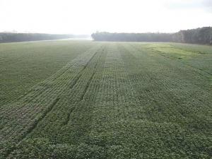 Frank Baumgartner, who farms near Princeton, N.C., recently called FARM SHOW to report a strange pattern he noticed this summer in a 32-acre field of soybeans. Photos taken with a drone by his grandson show marked differences in the crop’s color and height, which neither he nor anyone else can explain.