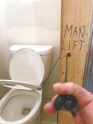 Plenty of males - and a few females - need to answer nature’s call while visiting him at his Minnesota chainsaw carving business. He solved the hygienic dilemma of lifting a toilet seat with a small hole drilled in a back riser under the toilet seat. An old work boot shoestring is knotted and run through it as well as holes in an unfinished stud wall next to the toilet. A knot on the outside wall makes a handy pull cord.
