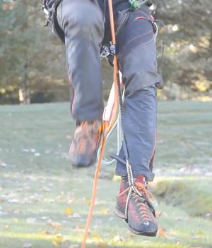 Climbing a rope to get up a tree or tower is faster and easier with a HAAS Ascent System. A conventional technique called rope walking uses a 2-point system where the operator pulls himself up the rope. As he climbs, he is alternately secured to the rope by the climbing harness or by a “rope grab” on one foot. The HAAS system adds a third point with a tether from the harness to the other foot.
