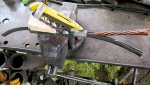 “I cut a slot in one side of the end of a steel pipe with a hacksaw,” says Stubbs. “The slot is just big enough for the draw knife blade. Then I slip the pipe into a short piece of square tubing and spot-weld it in place. Different size cables require different size pipes.”