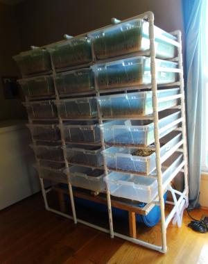 Caleb built a frame for the fodder system out of 3/4-in pvc pipe and 3/4-in pvc T and elbow connecters Each of the 6 shelves holds 3 plastic trays for the seed to grow in for a total of 18 trays each with holes drilled in the bottom to facilitate drainage Half of a 55-gal barrel under the shelf serves as a water reservoir which cycles the water through an irrigation array made of 1/2-in pvc pipe