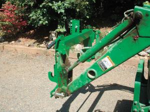 He had been using a 3-pt. mounted, 8-ft. rock rake to do the job. However, every time he wanted to use the rake he had to detach the backhoe on his Deere 970 backhoe loader and then attach a 3-pt. hitch, which got old. So he bought a Harbor Freight 3-pt. quick hitch and adapted it to fit the quick-tach mounting brackets on front of the loader.