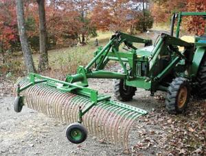 “It’s a real time saver and works great,” says Hewitt. “The rake’s 3-pt. bracket hooks up to the loader just like it hooked up to the 3-pt. hitch back of the tractor. But the rake now faces backward, so I have to pull the rake backward down my driveway. However, pulling the rake backward isn’t a difficult job because I always have a good view of what I’m doing. I leave the rake attached to the quick hitch permanently, which makes it easy to hook it up. I just pop 2 pins and am ready to go.”