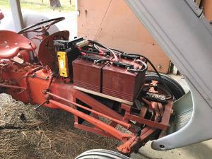 After removing the engine, he built a metal frame to mount a 10-hp. DC electric motor and the four 6-volt batteries. He left the tractor’s 4-speed transmission in place. “I start the tractor in 12 volts and flip a switch to go to 24 volts for full power.”