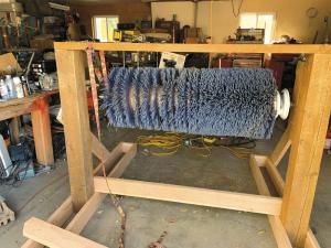 Westenhaver did an internet search and came up with an 8-ft. street sweeper brush from Repurposed Materials (www.repurposedmaterialsinc.com; ph 877 282-8733). He cut it into two 4-ft. lengths and mounted one section in a framework made from 6 by 6-in. posts. He set up the brush with a direct drive for an electric motor. He recognized that running it off a tractor pto would have been simpler, but he wanted to be able to run the machine inside if necessary.