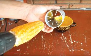 Cut the head off a 4-in. screw and insert that end into the chuck of an electric drill. Drive the screw into the end of an ear of corn and then, with the cob spinning, push it through the corn-shelling pipe. The kernels will fall out the other end of the pipe. Some kernels will be damaged so the idea won’t work if you’re planning to use the seed for planting.