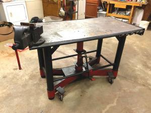 Rolling Work Bench Lifted By Foot-Operated Jack
