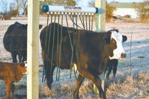 Davis recommends installing the curtain, which weighs less than 50 lbs. when filled with 3 gal. of diluted insecticide, on a crossbar over a gate where cattle go to drink or lick mineral blocks.