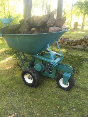 He says his powered wheelbarrow works great for hauling firewood because he doesn’t have to bend over when lifting the wood out. “It’ll pull 400 lbs. of wood with no problem, so I can stack the wood way higher than the wheelbarrow’s rim. The wheelbarrow has a high center of gravity, but we have mostly level ground so it’s not likely to tip over even with a heavy load of wood. However, it might not be stable enough to haul something heavier, like cement. The tractor has a reverse gear, which makes it easy to maneuver in small spaces.”