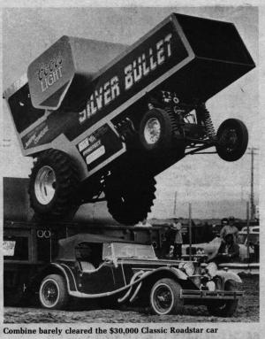 On the night of the historic jump, 6,000 spectators cheered as the combine embarked on its maiden flight. It roared down the 1,000 ft. runway at speeds close to 50 mph, off the 42-ft. long ramp, over a $30,000 Classic Roadstar car and landed on the ground on all four wheels. If the "jumping combine" had failed its maiden flight, it would have squashed the $30,000 car flat.