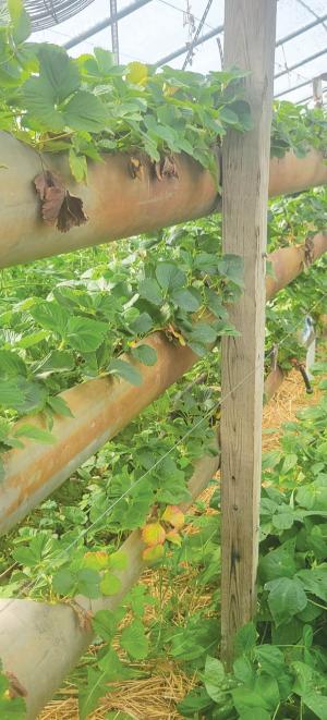 Kevin and Janet garden in two 20 by 72-ft. hoop houses and one that’s 20 by 24 ft. He refers to one of the hoop houses as their strawberry house. It has day-neutral strawberries in a vertical configuration of three levels of two pipes each.