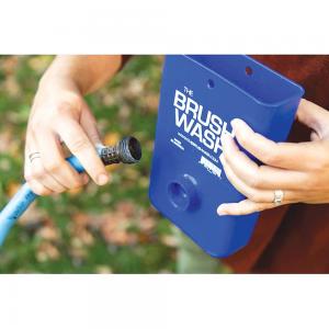 For outside use, hook The Brush Wash to a female hose connection. Place the brush inside the unit and turn on the water. Don’t forget the bucket underneath The Brush Wash.