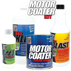 The kit comes with KBS Klean to wash away gunk, RustBlast to get rid of rust and corrosion, and Motor Coater, a durable engine enamel. Available in 39 colors, the high-performance and high-gloss paint can handle temperatures of up to 450 degrees and is impervious to oil and gas.